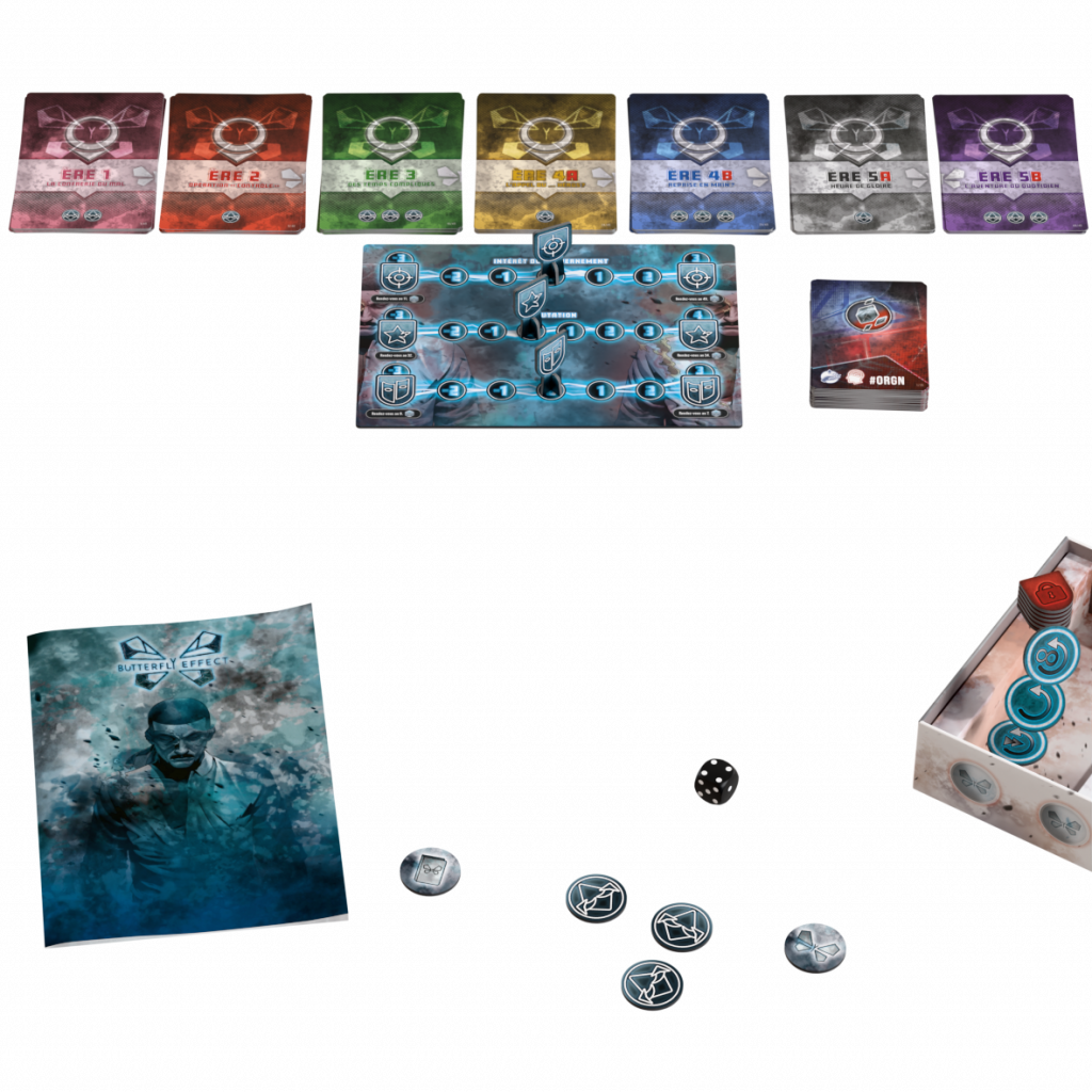 Butterfly Effect est un jeu narratif et coopératif dont la mécanique principale repose sur le choix. Tout au long de votre aventure, vous traverserez différentes Ères (temporelles ou géographiques). Chacune d’elles vous proposera diverses Actions à accomplir : à vous d’utiliser vos jetons Action pour les réaliser et façonner votre personnage. Chaque scénario introduit ses propres mécaniques renouvelant ainsi l’expérience Butterfly Effect.