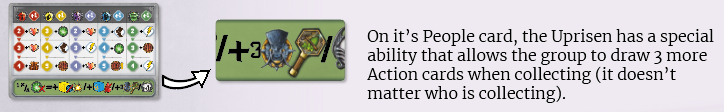 On it’s People card, the Uprisen has a special ability that allows the group to draw 3 more Action cards when collecting (it doesn’t matter who is collecting)