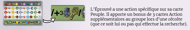 L’Éprouvé a une action spécifique sur sa carte Peuple. Il apporte un bonus de 3 cartes Action supplémentaires au groupe lors d’une récolte (que ce soit lui, ou non, qui effectue la recherche).